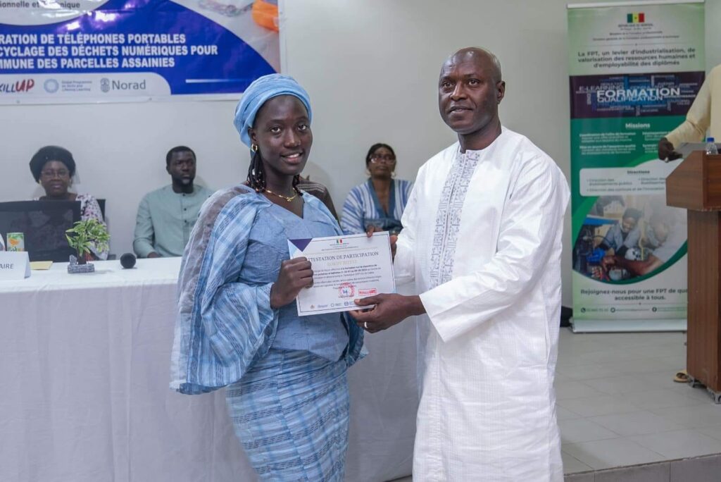 21 jeunes des Parcelles Assainies ont suivi une formation de 10 jours sur la réparation de téléphones portables et le recyclage des déchets numériques au Centre Sénégal Japon, une initiative financée par l’ONG SKILLUP, la DGFPT, et soutenue par la mairie. Ce vendredi 09 août, ils ont reçu leurs attestations lors d’une cérémonie officielle. Madame Camara Maimouna Kanté, représentant le Ministre de la Formation professionnelle, a salué ce projet, tandis que le maire Ababacar Diamile Sané a souligné l’engagement de la mairie à accompagner les jeunes vers l’entrepreneuriat, en s’alignant sur la stratégie du gouvernement pour l’insertion professionnelle.