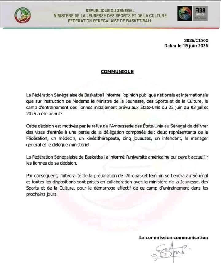 L’information a été rendue publique ce mercredi par la Fédération Sénégalaise de Basketball (FSBB) à travers un communiqué. La décision, prise sur instruction de Madame le Ministre de la Jeunesse, des Sports et de la Culture, fait suite à l’impossibilité pour plusieurs membres de la délégation dont deux représentants de la FSBB, un médecin, un kinésithérapeute, cinq joueuses, un intendant, le manager général et un représentant du ministère d’obtenir les visas nécessaires à leur entrée sur le sol américain.