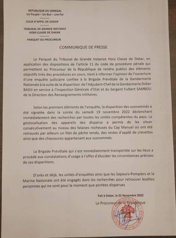 Dans le document, le chef du parquet d’alors, informe que la disparition des deux officiers a été signalée dans la soirée du samedi 19 novembre 2022. Que la géolocalisation de leurs appareils a permis de les situer « au niveau des falaises rocheuses du Cap Manuel où ont été retrouvés par ailleurs un filet de pêche tendu, des restes d’appât de crevettes ainsi que des chaussures appartenant aux susnommés ». (Image 2)