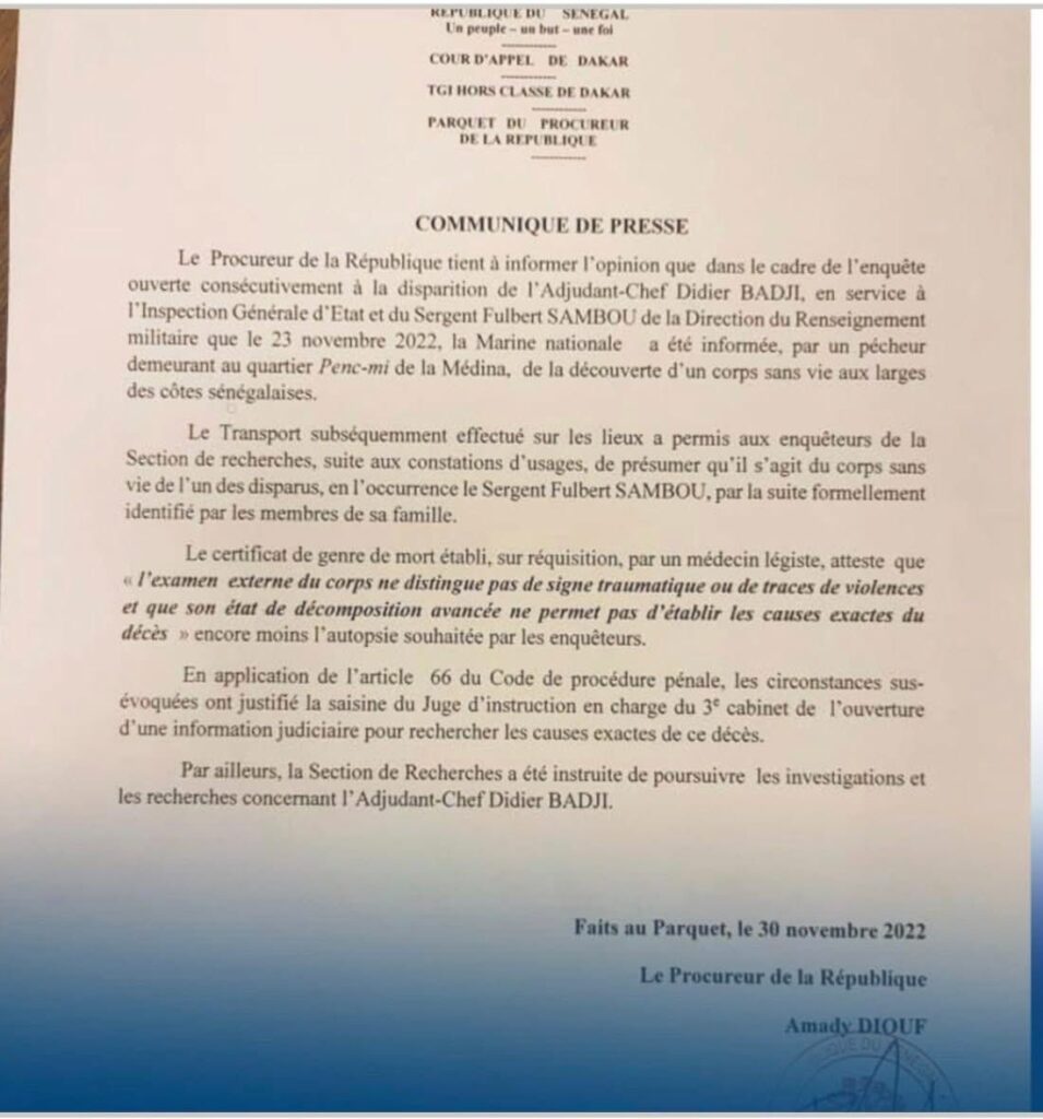 Le 30 novembre 2022, le Procureur Amady Diouf (image 4) sort un autre communiqué pour annoncer la découverte du corps de Fulbert Sambou, le 23 novembre, par un pêcheur demeurant au quartier Penc-mi de la Médina, qui a alerté la Marine nationale. Il affirme également que des membres de la famille du défunt ont formellement identifié le corps.